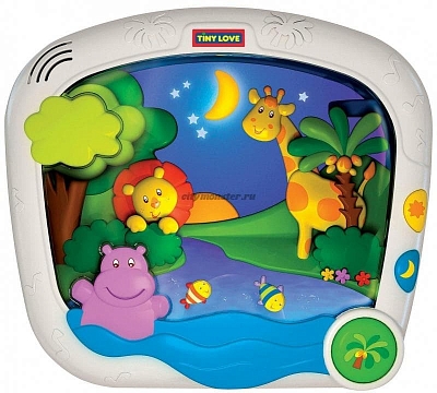 Игрушка «День и ночь» частично совмещает в себе функции мобиля (музыка, ночничок), но может сопровождать ребёнка более длительный период. Это игрушка, которая развлечет Вашего малыша во время бодрствования и поможет спокойно уснуть и видеть приятные цветные сны! С новым ночником Вы сможете начать приучать ребенка к самостоятельному засыпанию и пробуждению. За прозрачным экраном расположен удивительный мир с богатой флорой и фауной. В нем Ваш малыш встретит доброго львенка, милого жирафчика и озорных рыбок. Веселый бегемот, который вынырнул из волн и расплескал брызги, а также зеленая листва дерева находятся с наружной стороны игрушки — это объемные элементы. Они есть внутри и снаружи игрушки. Объемные элементы создают иллюзию реальности картинки. По периметру игрушки расположены кнопки для выбора режима игры.