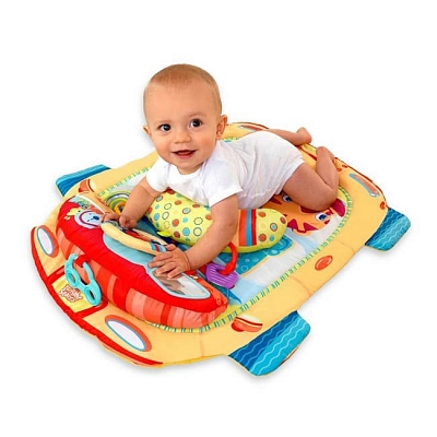 Коврик выполнен в виде машинки, у которой есть руль, щелкающий при вращении, и безопасное зеркальце, которое поможет малышу изучить себя. На коврике также есть кольцо-погремушка, прикрепленное к подушечке, и ключик-прорезыватель, который поможет снять боль воспаленных десен при появлении зубок. Коврик имеет 4 дополнительных колечка для подвешивания игрушек (игрушки приобретаются отдельно). Коврик "Автомобиль" можно стирать в стиральной машине.
