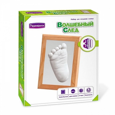 Волшебный след - набор для совместного творчества. Приложите ладонь к поверхности специального раствора, и он навсегда сохранит мельчайшие детали ручки малыша. Этот набор поможет оставить великолепную память о первых месяцах ребенка. Когда-нибудь он приложит руку (или ногу) к отпечатку, и удивится, каким маленьким он был.