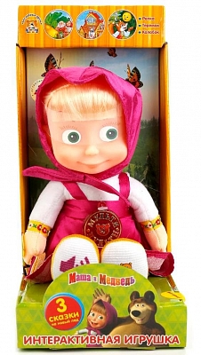 Мягкая интерактивная игрушка Маша из любимого известного мультфильма "Маша и Медведь". Маша приятная на ощупь, так как сделана из мягкого текстиля, что не может не понравиться малышу. Высота 30 см позволит взять ее с собой куда угодно. Если игрушке нажать на левую ручку, она расскажет 3 сказки на новый лад ("Репка", "Теремок", "Колобок"). На правой ручке находиться кнопочка "Пауза", а нажав на ножку, можно регулировать громкость (3 уровня громкости). Развивает фантазию, память, тактильное и звуковое восприятие.