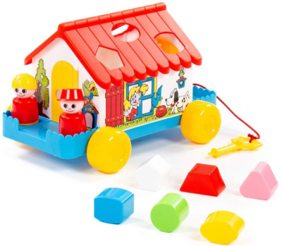 Развивающий домик для детей до 3-х лет. На крыше домика логическая задача - ребёнку нужно сопоставить фигурки (6 шт.) с отверстиями-пазлами. С двух сторон домика есть дверки, которые открываются, и можно достать из домика фигурки. Одна из дверок открывается ключом. Кроме того, в комплект входят 2 фигурки человечков, они устанавливаются в специальные углубления и позволяют ребёнку разыгрывать различные сюжеты. Домик можно катать благодаря наличию колёсиков и шнурка. Размер игрушки 26.5 х 18.5 х 16.5 см.