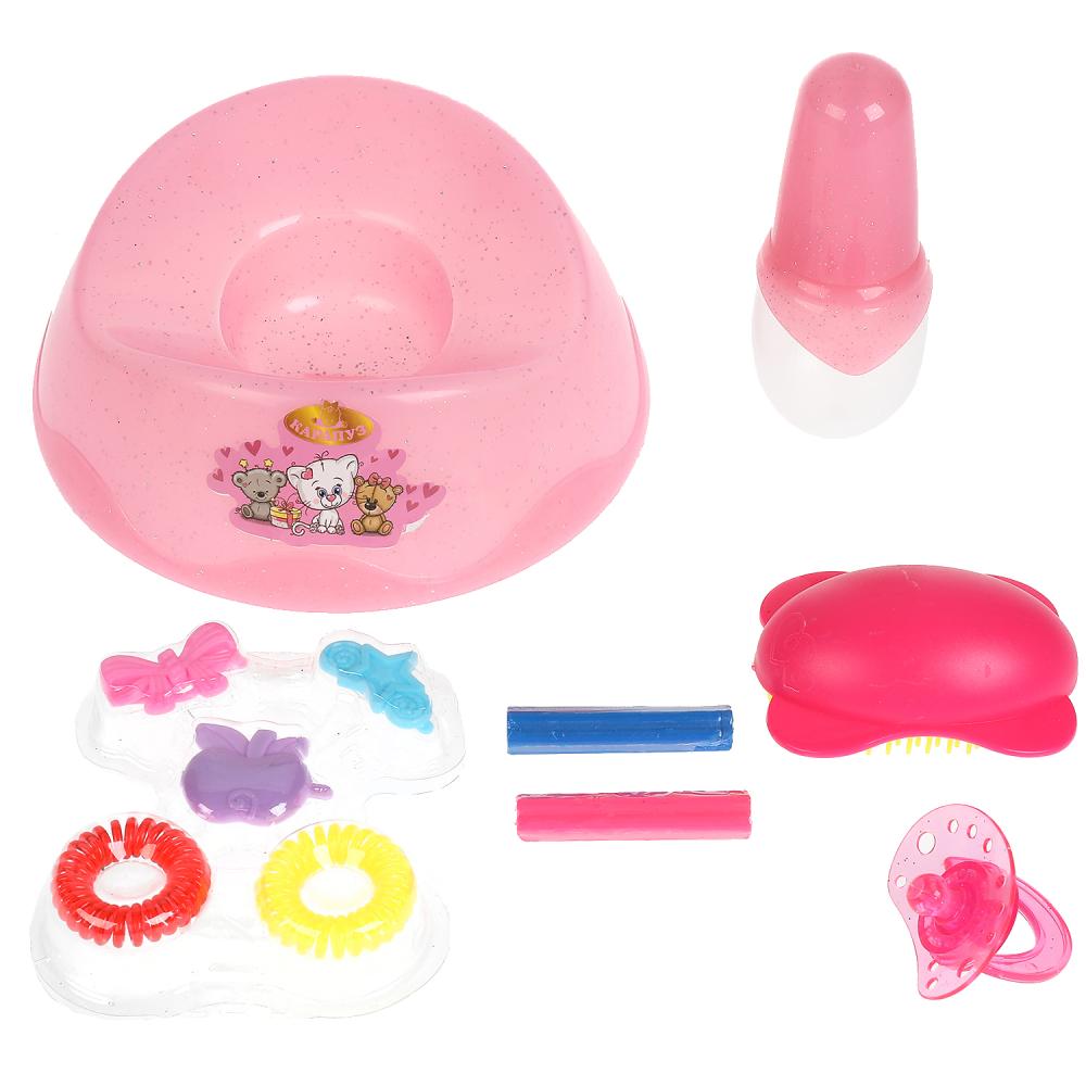 Кукла, горшок, ботиночки, бутылочка, соска, расчёска, резинки, заколки, 2 мелка для волос