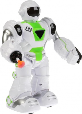 Двигается вперёд, двигает руками, , стреляет пулями, световые и звуковые эффекты
