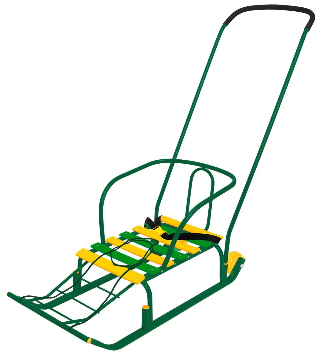 Спинка, ручка, ремень безопасности, пластиковые колеса, буксировочный трос